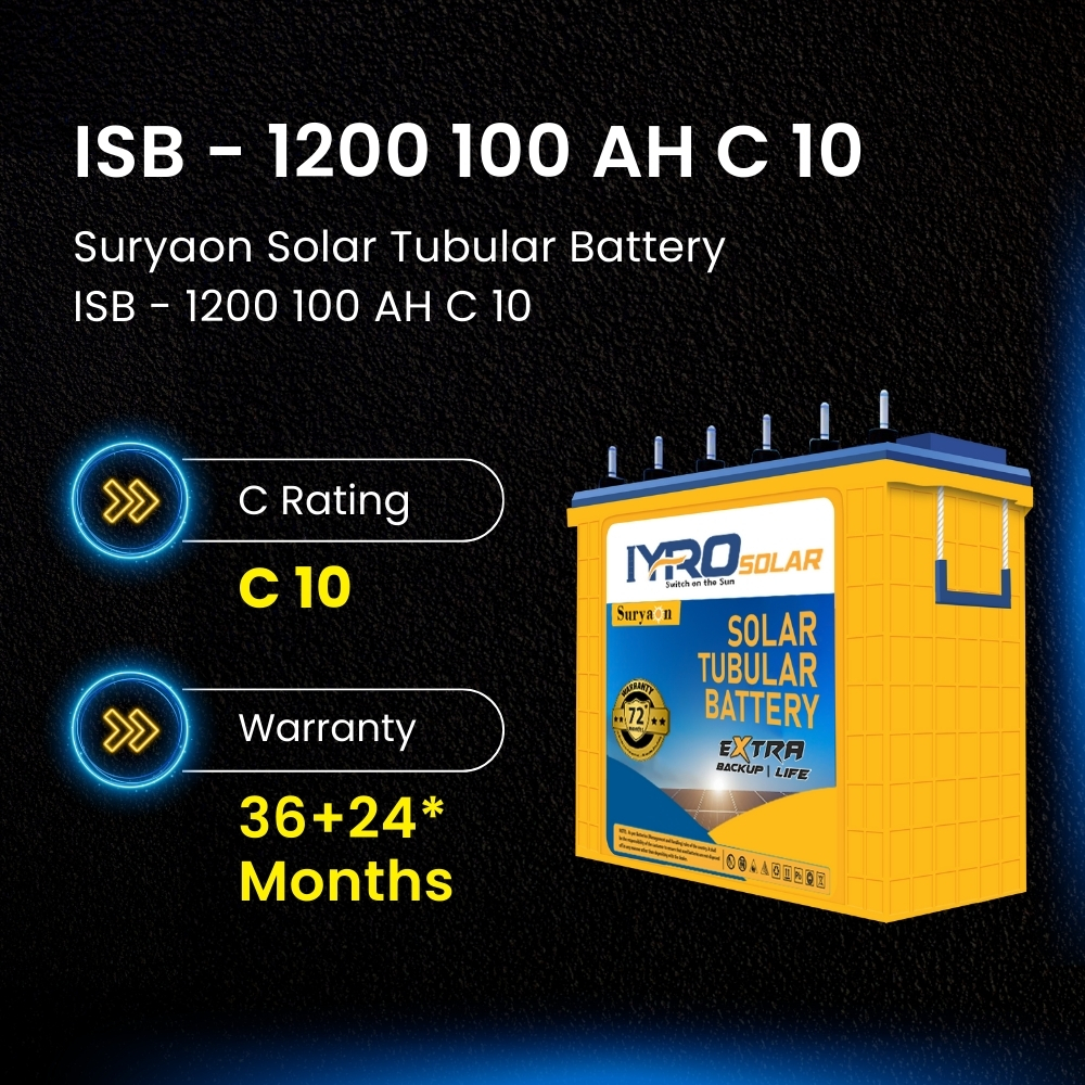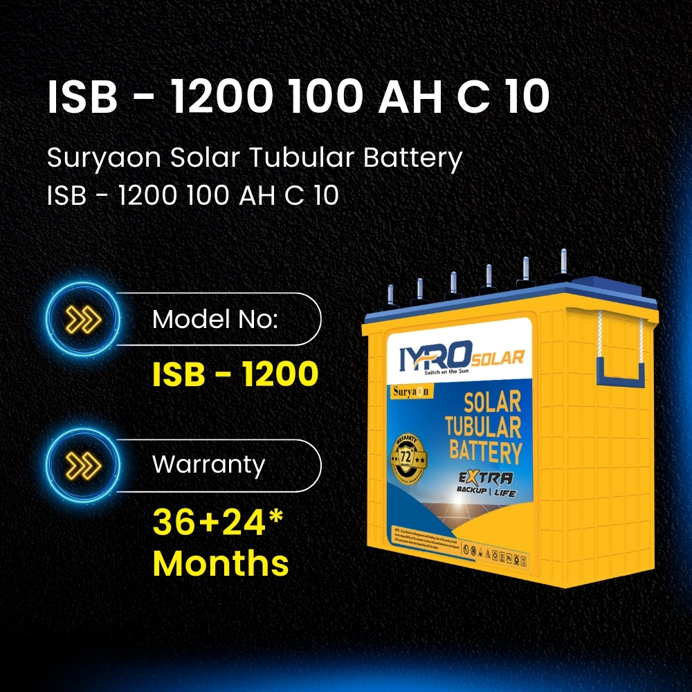 The Suryaon Solar Tubular Battery ISB - 1800 offers 150 AH capacity, ideal for residential solar systems, providing reliable and cost-effective energy storage with extended warranty coverage.