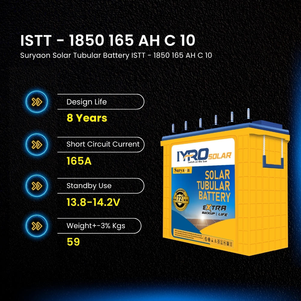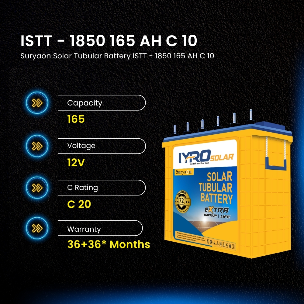 Description: Suryaon Solar Tubular Battery ISTT - 1850 is a high-performance battery offering 165 AH capacity, providing reliable energy storage for solar systems with a 36-month warranty.